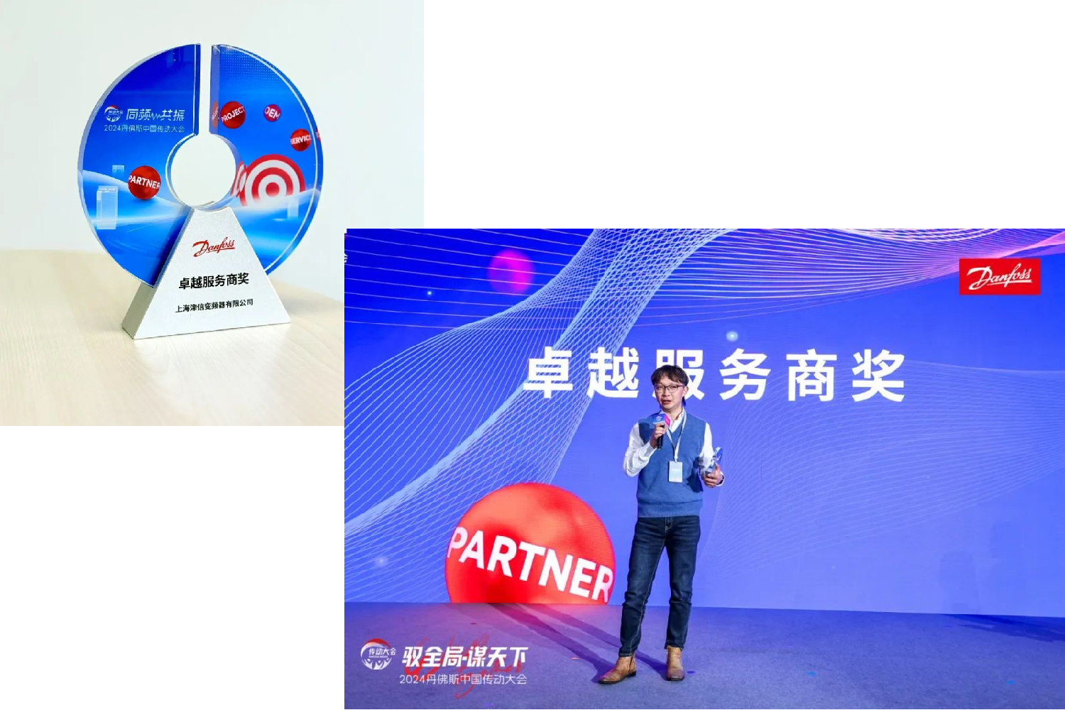 頒獎晚宴上,上海津信變頻器有限公司憑借優質的服務水平和業績,榮獲丹佛斯2024年度“卓越服務商獎”。總經理徐祖頡先生表示:“一直以來,上海津信始終秉持 “走技術和服務的路線,以客戶為導向” 的理念,將技術和服務視為公司發展的核心驅動力。本次獲獎不僅是對我們工作的高度認可,更是對我們持續深耕技術服務領域的激勵。未來,我們期望與丹佛斯進一步深化合作,不斷提升服務水平,共同開拓更廣闊的市場,為客戶創造更大的價值。”