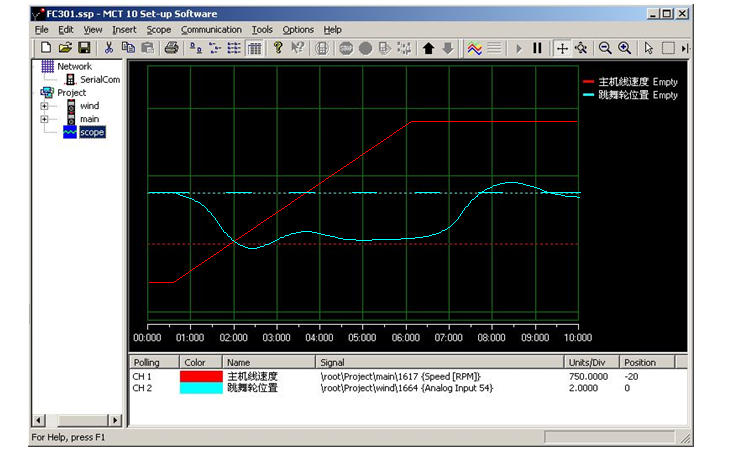卷繞控制的特點:同樣的一套PID調節(jié)參數,勻速時易于穩(wěn)定,波動也較小;而加速時就不易于穩(wěn)定,而且因為跳舞輪位置有靜差,波動幅度也較大。因此PID調節(jié)參數主要針對加減速過程予以優(yōu)化。MCT軟件有數字示波器功能,通過實時觀測線速度和跳舞輪位置在加減速時的變化曲線,能很方便地調整調節(jié)參數。