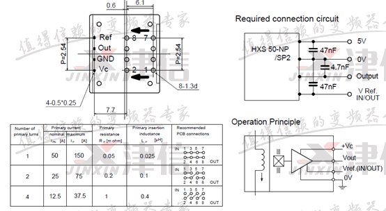 3、測量三相輸出電流檢測電路,查看電流傳感器型號為HXS 50-NP,測量輸入電源只有2.4V,而HXS 50-NP正常工作的輸入電源為5V??梢源_定故障點在此。接線圖如下: