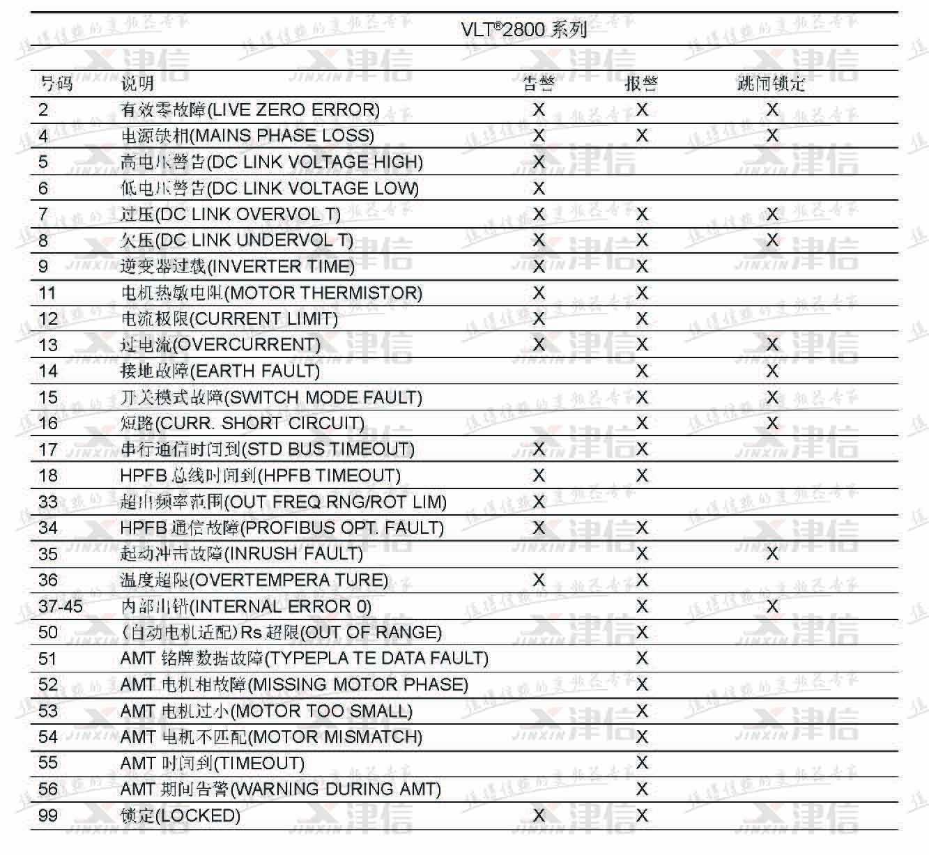 丹佛斯VLT2800系列變頻器故障代碼和報警信息如下: